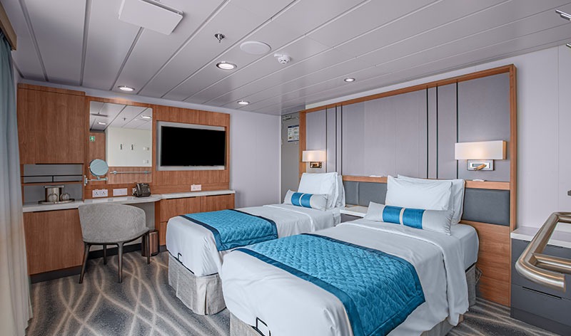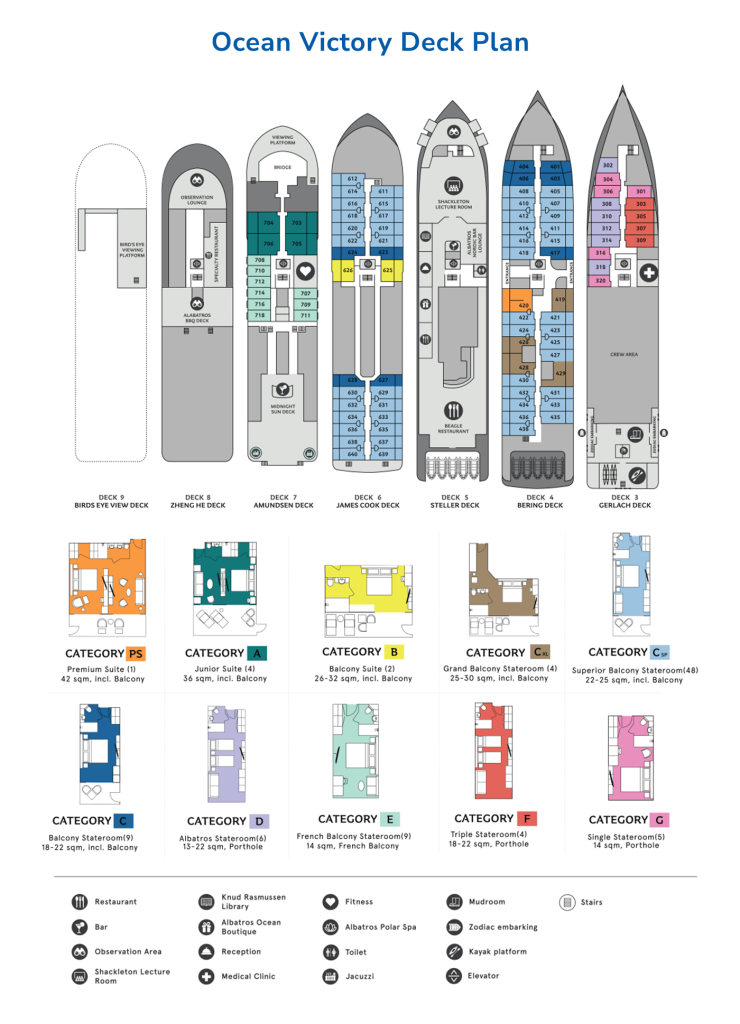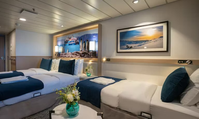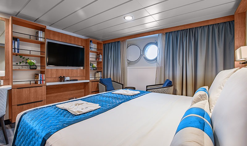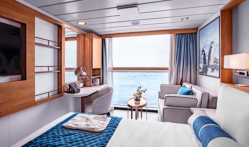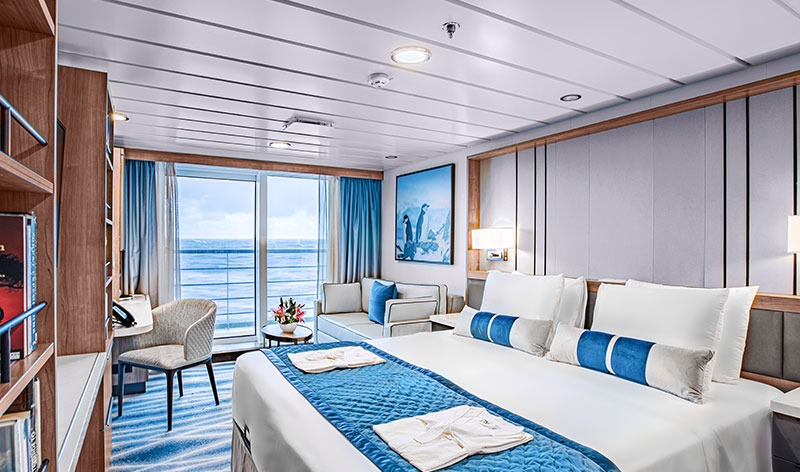 All of the 94 comfortable cabins have an ocean view; 70% with their own private balcony. Most rooms can be configured as either two single beds or conjoined to form a double (European king). There is a choice of dining options, a wellness area, a sauna, an open deck dining facility and a spacious presentation lounge onboard.